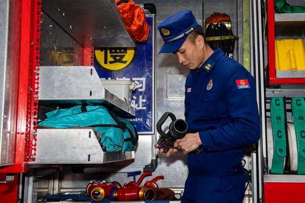 在順江特勤站交接班上,石亞斌認真檢查一號車水槍。張龍攝