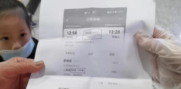 拿著“車票”的旅客姓李,今年68歲了。她獨自帶著自己的孫女計劃從沙坪壩站乘車前往榮昌北站。因為不識字,平時也少有出行,子女想到了將車票信息打印出來的辦法,讓老人帶在身上。