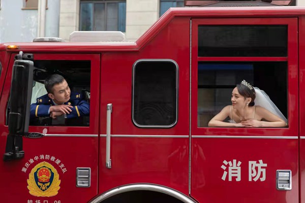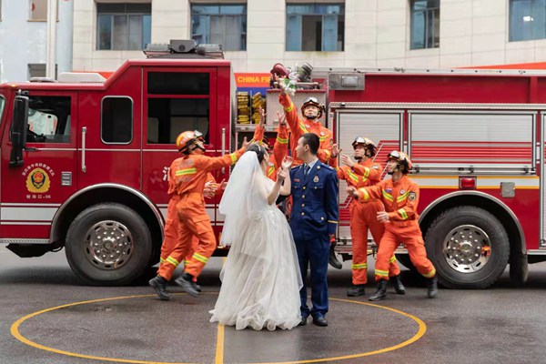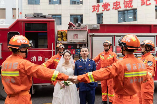 王飛在重慶市渝中區較場口消防救援站拍攝的婚紗照。受訪者供圖