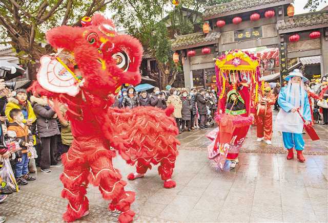 二月一日,沙坪壩區磁器口古鎮老街,舞獅、劃旱船等表演引來眾多游客駐足觀看。記者 張錦輝 攝\視覺重慶