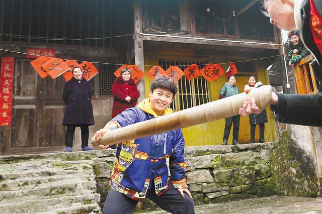 2月1日,黔江區阿蓬江鎮黃連村村民在參加扭扁擔比賽。特約攝影 楊敏/視覺重慶