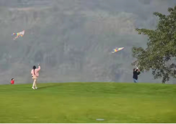 市民在大魚海棠廣場打卡無邊水池。郭旭攝