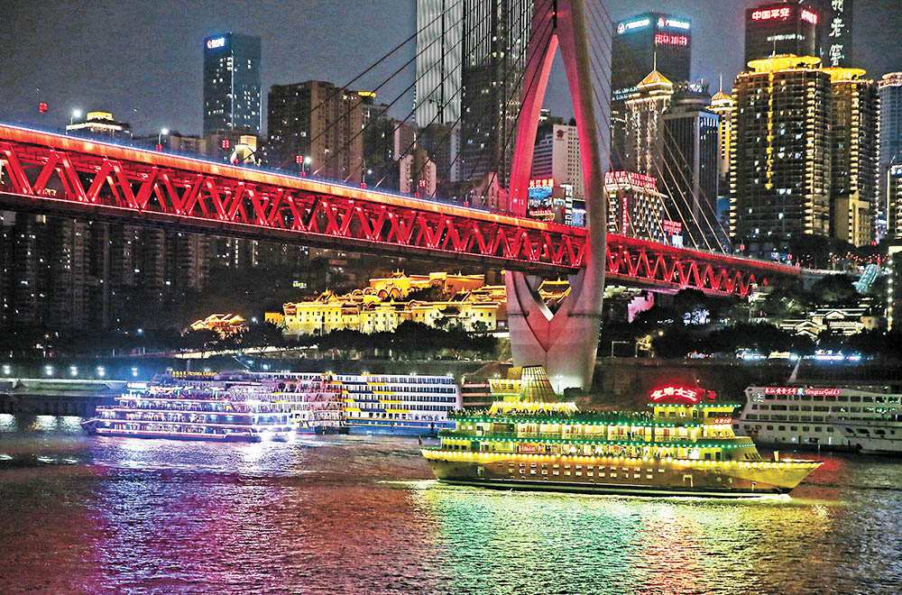 2月5日晚,觀景游輪行駛在東水門大橋下;⒛甏汗,不少市民和外地游客選擇乘坐兩江游輪觀賞兩江四岸迎春燈飾,喜慶夢幻的光影贏得點贊。 特約攝影 鐘志兵/視覺重慶