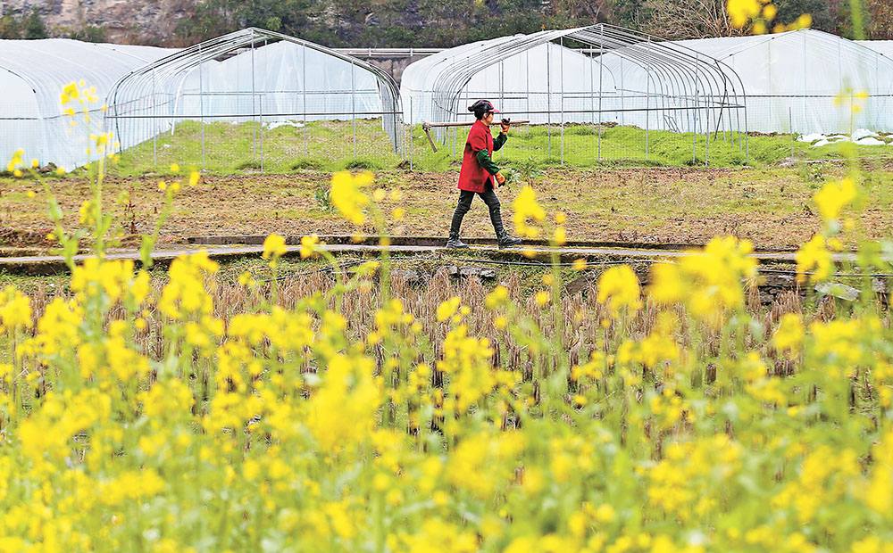 2月6日,黔江區中塘鎮勝利村,村民走在油菜花掩映的田野上。當天是正月初六,春回大地,當地農民開始在田間地頭忙碌起來。