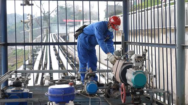 川維物流碼頭裝卸人員正在開展化工品裝載操作。陳琳攝