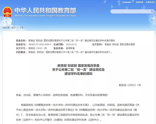 據悉,根據國務院《統籌推進世界一流大學和一流學科建設總體方案》,以及教育部、財政部、國家發展改革委《關于深入推進世界一流大學和一流學科建設的若干意見》和《統籌推進世界一流大學和一流學科建設實施辦法(暫行)》,經專家委員會認定,教育部等三部委研究并報國務院批準,公布了第二輪“雙一流”建設高校及建設學科名單和給予公開警示(含撤銷)的首輪建設學科名單。