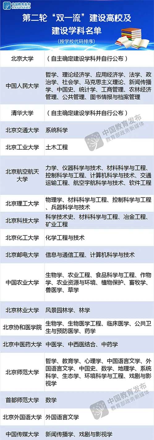 在《教育部 財政部 國家發展改革委關于公布第二輪“雙一流”建設高校及建設學科名單的通知》中指出,北京大學、清華大學在第二輪“雙一流”建設中自主確定建設學科并自行公布。給予公開警示的首輪建設學科,應加強整改,2023年接受評價。(袁杰)