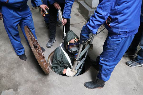 防護服、便攜式氣體檢測儀、正壓式呼吸器、安全帽、探物桿、云梯等所有裝備依次擺放,王勇等人訓練有素,快速穿戴,待污水抽排干凈,即可下池作業。