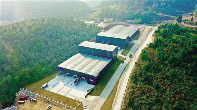 在正在建設中的水江隧道出口附近,一排灰綠色的鋼結構廠房矗立在兩座山體之間,廠房因地勢而建,遠遠望去,同周邊的山色融為一體。其中兩座廠房之間,5根藍綠色密封傳送道交錯著,呈“X”狀連接著廠房,整個園區就像是一座濃郁工業風的公園。