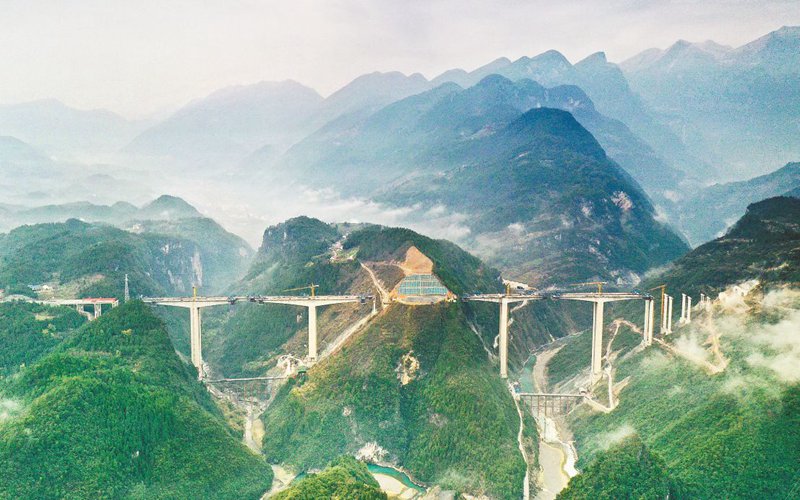 圖為城開高速墩高最高的橋梁——南長溝特大橋即將合龍。