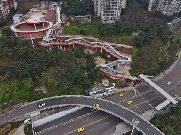 據了解,蘇家壩步道觀景平臺項目,起于軌道3號線銅元局站止于雙峰山路,包括人行步道、觀景平臺、電動扶梯及燈飾等,其中觀景平臺由大小兩個圓環組成。從軌道3號線銅元局站出站,經梯道步行至蘇家灣公交車站,就能看到正在修建的步道。銅元局站步行便捷性提升改造方案在現狀步道基礎上,向南新增上山步道,一直延伸至雙峰山路的金輝江城里和香彌山1號小區之間。