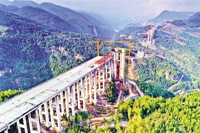 圖為2月13日拍攝的建設中的渝湘復線高速雙堡特大橋。