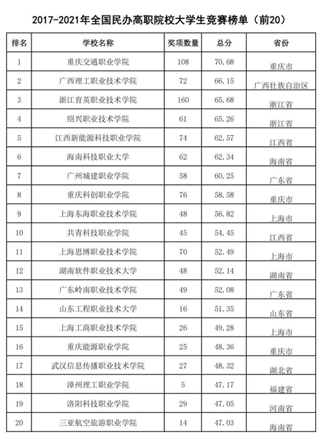 2月22日,中國高等教育學會高校競賽評估與管理體系研究工作組發布2021全國普通高校大學生競賽分析報告,其中包含本科院校大學生競賽榜單13個、高職院校大學生競賽榜單10個、省份大學生競賽榜單3個。重慶交通職業學院在“2017-2021年全國民辦高職院校大學生競賽榜單”中位列第1名。