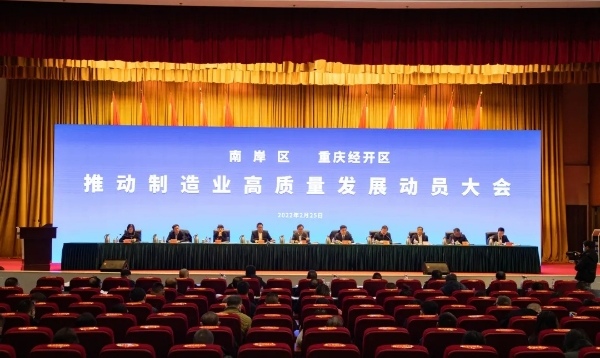 人民網重慶2月26日電 2月25日下午,南岸區、重慶經開區推動制造業高質量發展動員大會舉行,發布《南岸區重慶經開區制造業躍升發展攻堅行動方案》,明確將堅定不移實施制造強區戰略,全力推進三大行動,重點實施六大工程,力爭到2024年,創新發展步入快車道,規上工業企業研發機構覆蓋率超過65%,創建綠色技術創新中心、綠色工程研究中心,高質量建設國家綠色產業示范基地,工業總產值邁入千億俱樂部。
