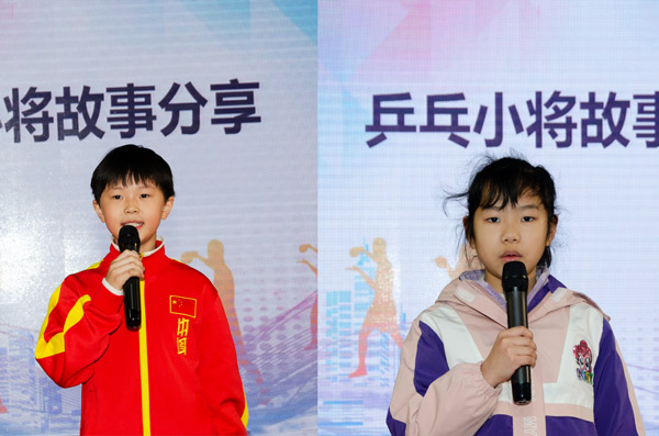 兩位小將在儀式上講述了自己與乒乓球的故事。橡樹灣小學供圖