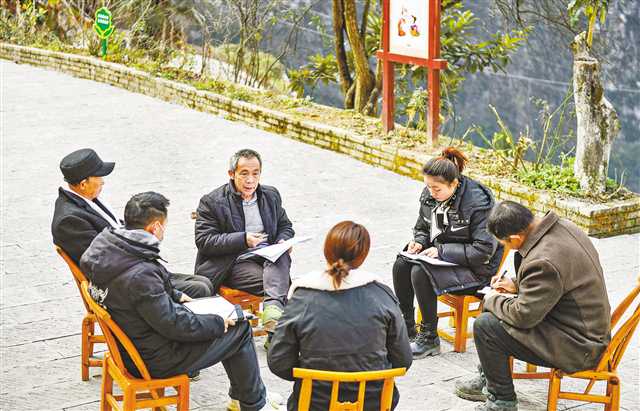 二月十五日,巫山縣竹賢鄉下莊村,毛相林(左三)和村干部及駐村干部開院壩會謀劃工作。
