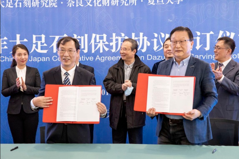 人民網重慶3月2日電 為全面提升大足石刻保護基礎與理論研究水平,推進石窟寺科技保護及預防性保護工作,3月1日,大足石刻研究院、復旦大學、日本奈良文化財研究所通過在線視頻方式分別在重慶市大足區和日本奈良市舉行中日合作大足石刻保護協議簽訂儀式。