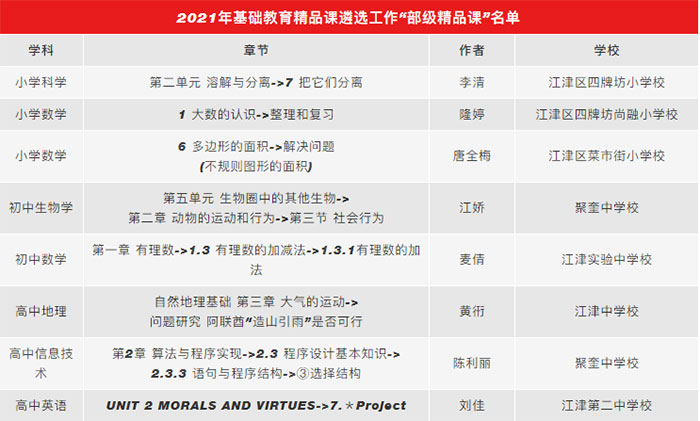 據了解,2021年底,重慶市教委公布了《重慶市“基礎教育精品課”遴選工作“市級精品課”名單》,江津區39節課例獲得“市級精品課”,并報送參加部級評選(重慶市共評選857節)。