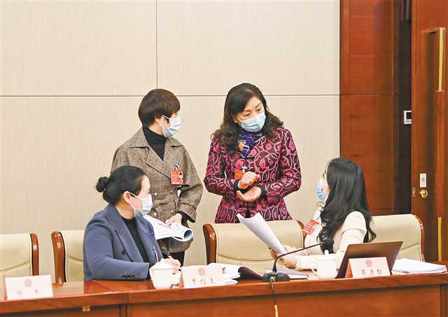 3月7日上午,重慶代表團小組會議結束后,李紹玉代表、石淑蘭代表、李秋代表、吳彥?代表(從左到右)就提升基層婦女兒童醫療能力的話題進行討論。記者 蘇思 攝/視覺重慶