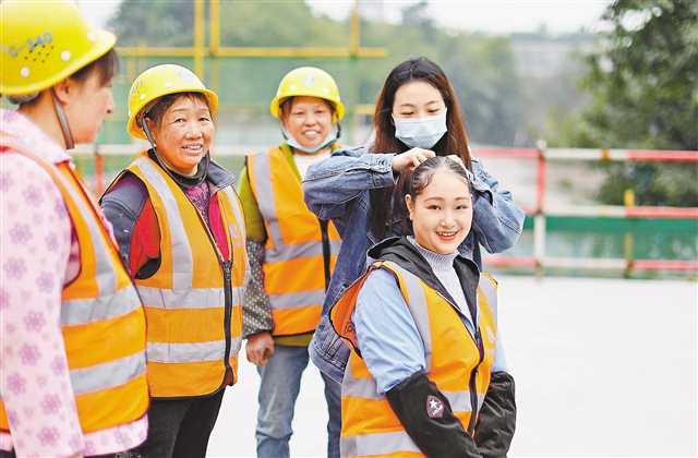 3月5日,在中建八局四公司西南公司一項目部,化妝師為建筑女工化妝。特約攝影 孫凱芳/視覺重慶