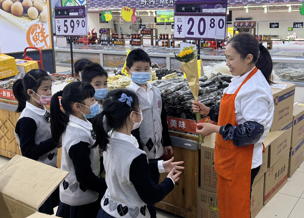 孩子們向超市售貨員贈送節日禮物。魯能巴蜀小學供圖