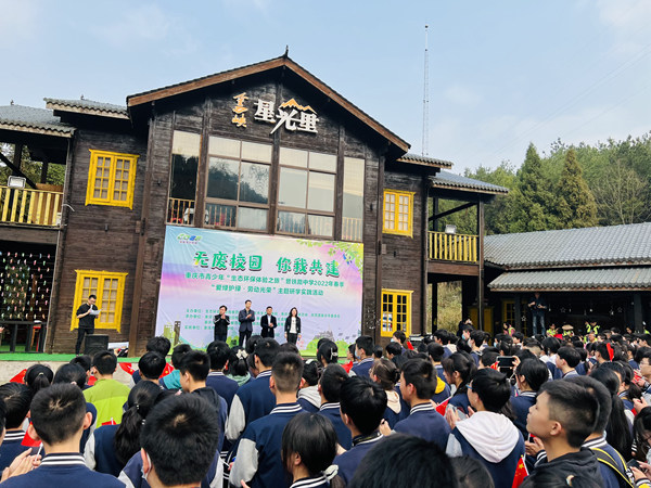 活動在《光榮啊,中國共青團》歌曲中拉開序幕,鐵路中學800余名學生來到教育基地,在這里開展“生態環保體驗之旅”;顒觾x式上,重慶市青少年社會教育協會生態環保志愿者向同學們介紹了生態環保教育知識,讓他們了解什么是“無廢城市”,為什么要建設“無廢校園”等,并向同學們發出了環保的倡議。