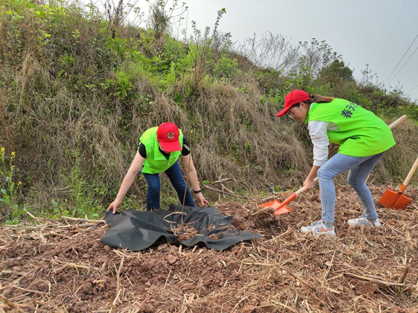 活動現場,大家熱情高漲,擼起袖子,默契協作,有條不紊地開始了種植工作,有的揮鋤鏟土,有的放苗回填,有的扶正壓實,有的提水澆灌,參加活動的志愿者們還特意準備黑色地膜,既控制野草生長,又有效防止水分蒸發……泥土沾在了他們的褲腳,汗水掛在了大家的臉上,植樹現場熱火朝天、干勁十足。