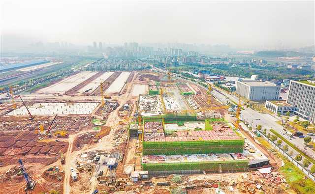 3月9日,位于沙坪壩區的重慶國際物流樞紐園區,陸海新通道重慶無水港項目正在加緊建設。