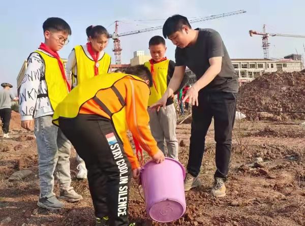 人民網重慶3月14日電 近日,墊江玉鼎小學組織開展“參觀新校區 播種希望向未來”植樹節系列活動。學校組織師生、校外輔導員參觀新校區,介紹新校區規劃、建設情況,并在新校區勞動實踐基地種植柑桔、桃樹、李樹100余株,為新校區添綠增彩。