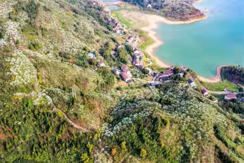 廣安華鎣市利用華鎣山天池湖畔治理后的石漠化土地栽植的“天池脆李”,每到春天到來,湖畔漫山遍野如雪的李花把天池湖映襯得美侖美奐,恰似“錦繡花湖”。(華鎣市融媒體中心)