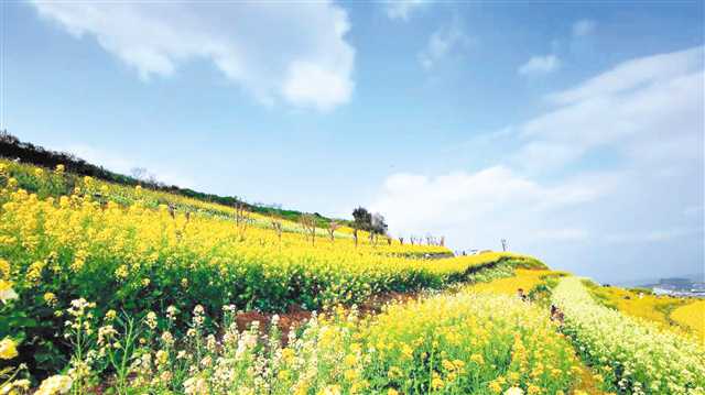 3月春風來,大地百花開。遠望跳磴鎮金鰲山200畝油菜花田,像從云彩里透下的一抹陽光鑲嵌在平緩的山巒上。不少游客前來賞花游玩,盡情享受油菜花盛開帶來的喜悅。