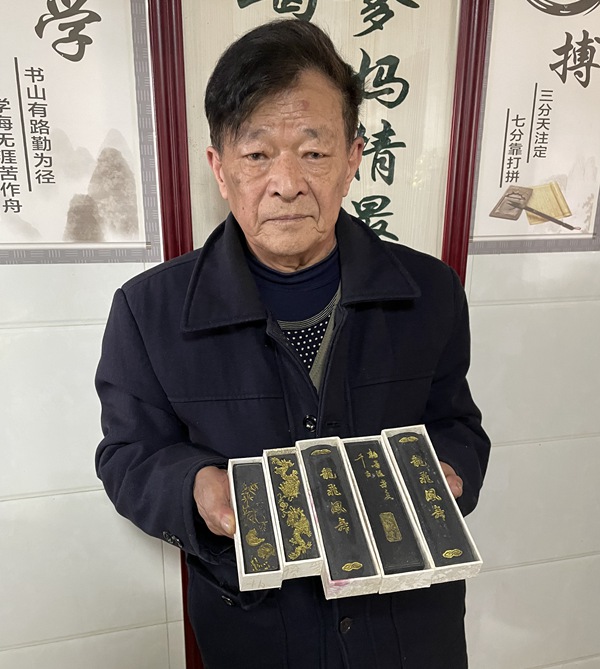 談話間,何文凱拿出珍藏的兩箱墨,碼放整齊,不落塵垢,陽光下熠熠生輝,靠近一聞,清冽之余,墨香濃郁,縈繞鼻腔,不曾斷絕。