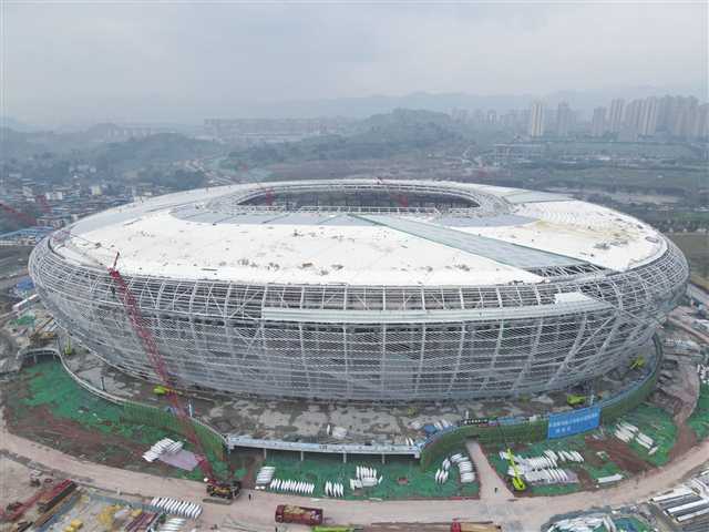 龍興足球場完成主體和鋼結構施工、外立面1.2萬平方米示范幕墻已盛裝亮相、場館建設進度領跑“亞洲杯”6個新建場館……
