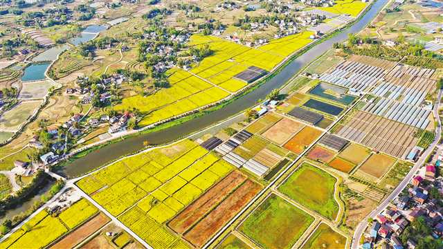 3月17日,俯瞰梁平區云龍鎮人民村、三清村,大棚、魚塘、油菜田與“中國最美河流”重慶龍溪河(梁平段),構成一幅秀美的新農村畫卷。