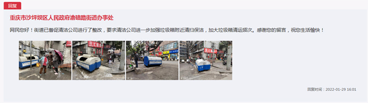 針對網友反映的問題,重慶市沙坪壩區渝碚路街道在人民網“領導留言板”快速作出回應:網民您好!街道已督促清潔公司進行了整改,要求清潔公司進一步加強垃圾箱附近清掃保潔,加大垃圾箱清運頻次。感謝您的留言,祝您生活愉快!