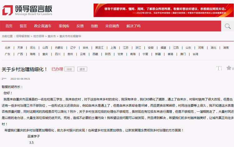 人民網重慶3月21日電 (陳琦)近日,一位重慶市巫溪縣高三學生通過人民網“領導留言板”給重慶市市長胡衡華留言,他建議鄉村治理更加“精細化”,助力鄉村振興實現。