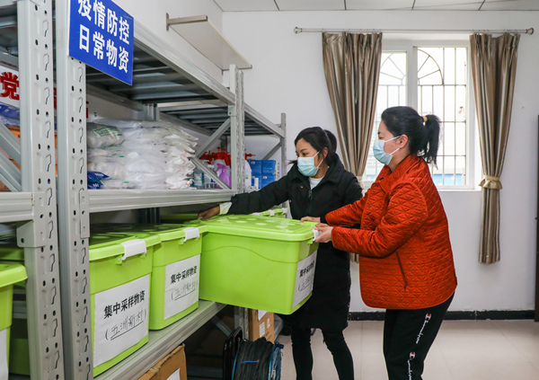 石馬河街道南橋寺社區疫情防控物資分類存放。曹檢攝
