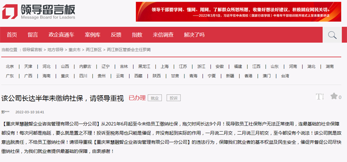 “感謝‘領導留言板’和兩江新區稅務局工作人員,上周稅務局一位老師給我來電話詳細溝通了辦理情況,公司負責人也承諾將盡快補繳社保!”該網友在電話中再三表示感謝。
