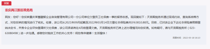 針對網友的留言,重慶兩江新區稅務局回復稱:兩江新區天宮殿稅務所通過現場約談、查詢系統等方式,對網友反映的情況進行了核實。經查,該公司從2021年09月起截至2022年03月14日,欠繳社會保險費共計63810.88元。