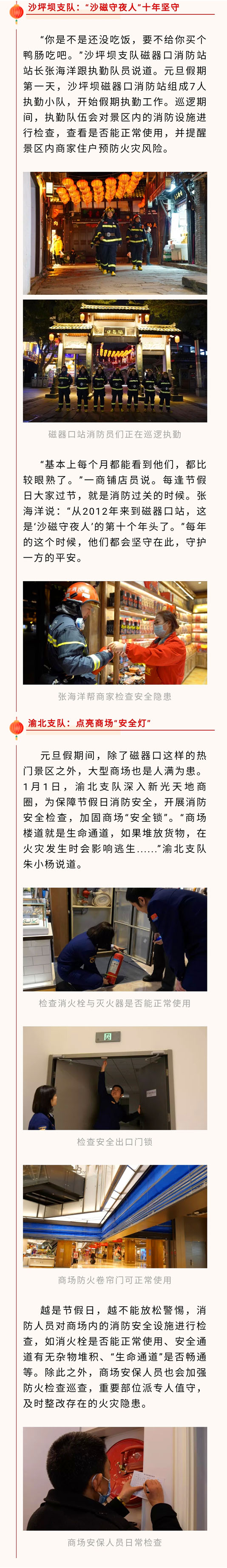 元旦假期,重慶迎來了旅游高峰期,在元旦假期前后,重慶各區縣消防救援支(大)隊開展消防安全檢查,為假期消防安全加固“安全鎖”,1月4日,重慶市消防救援總隊帶我們一起來尋找大街小巷里“藍朋友”四處穿梭的身影吧。ㄍㄓ崋T 唐青青 周盈杉 陳啟唯)