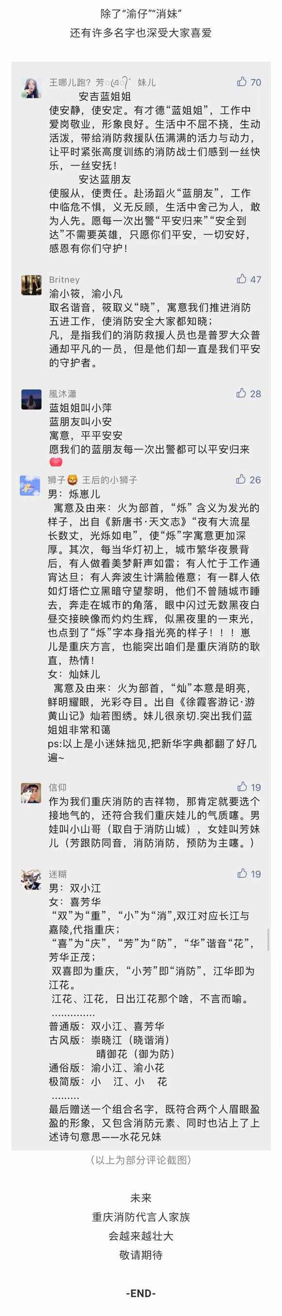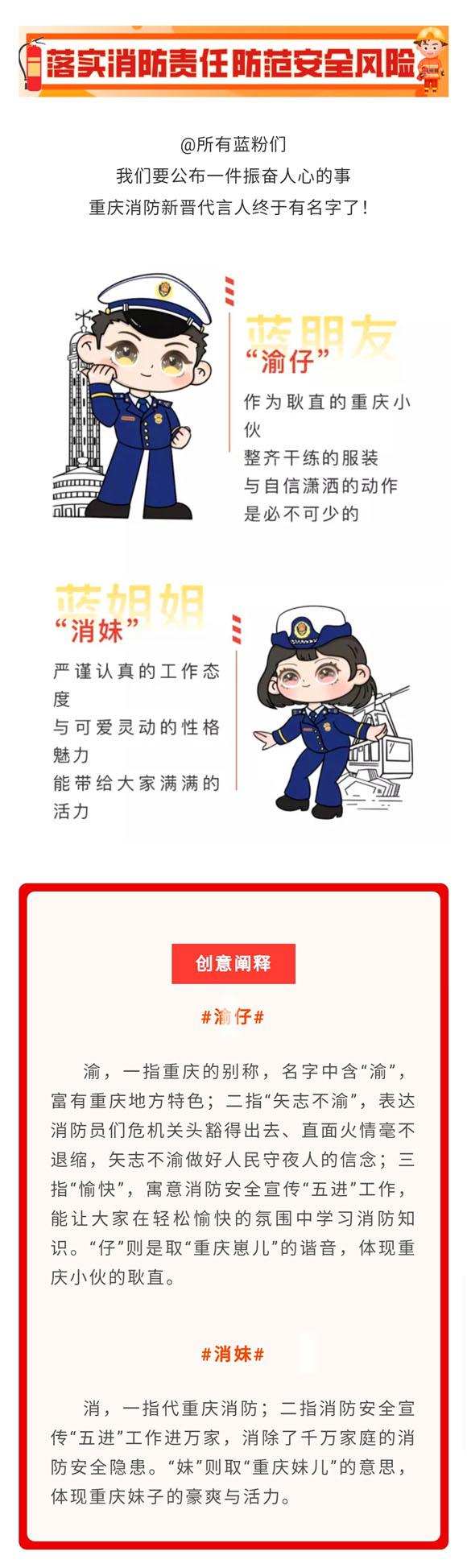 近日,通過廣大網友集思廣益,重慶消防新晉代言人終于有名字了,分別是“渝仔” “消妹”。除了“渝仔”“消妹”,還有許多名字也深受大家喜愛,接下來,重慶消防代言人家族會越來越壯大,敬請大家期待。(楊雯翕)