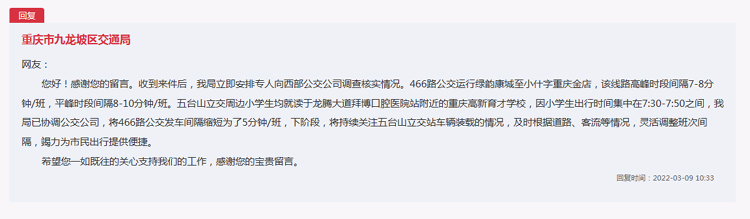 該局于3月9日回復稱,466路公交運行綠韻康城至小什字重慶金店,該線路高峰時段間隔7-8分鐘/班,平峰時段間隔8-10分鐘/班。五臺山立交周邊小學生均就讀于龍騰大道拜博口腔醫院站附近的重慶高新育才學校,因小學生出行時間集中在7:30-7:50之間,我局已協調公交公司,將466路公交發車間隔縮短為了5分鐘/班。