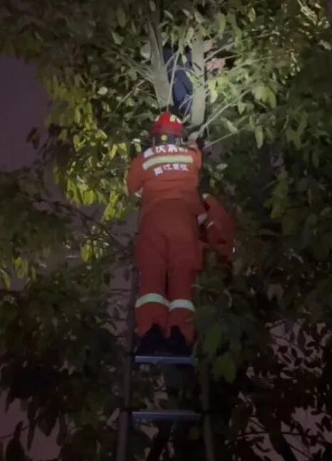 一名恐高的小伙被困在了樹上
