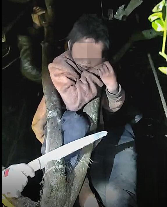 接到報警后,當地消防立即派人前往處置。由于男孩的腿部有些腫脹,消防員在保證不傷害到男孩的情況下,使用手鋸對樹杈進行破拆。