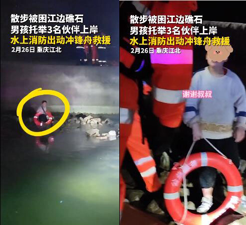 @重慶消防 消息,2月26日,重慶江北。4名男孩散步被困江邊礁石,12歲男孩托舉3名伙伴上岸后,因體力不支無法爬上岸。重慶水上消防出動沖鋒舟前往救援,將男孩安全帶回岸邊。渝仔消妹提醒家長一定要隨時注意小朋友的行蹤,并叮囑小朋友們,不要隨意結伴前往江邊游玩!