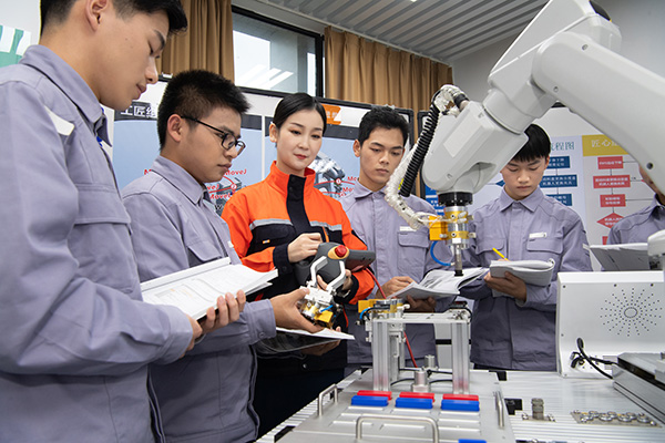 據了解,《基于視覺識別的裝配機器人應用編程》這門課程一方面實現了學生所學與企業所需高度匹配,解決了校企合作中學校熱企業冷的痛點。該課程精準對接企業崗位需求,培養企業準員工,縮小了育人目標與企業崗位需求的差距。每到畢業季,各大智能制造企業提前“預定”工業機器人技術專業的畢業生,達到了“供不應求”的程度。此外,通過比賽,參賽團隊帶動了更多的老師在日常教學中深入研究專業教學,在教學中取長補短、相互學習,在感悟與體驗中實現教學理念與教學實踐的飛躍!氨荣惖哪康牟粏螁问谦@獎,更重要的是提升視野、打開思路、拓寬教育教學理念,實現以賽促教、教學相長!绷貉嗾f。