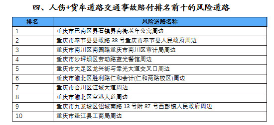 《重慶市2021年度道路交通事故保險理賠風險路段》報告中,人傷+貨車道路交通事故賠付排名前十的風險道路。重慶市保險行業協會供圖