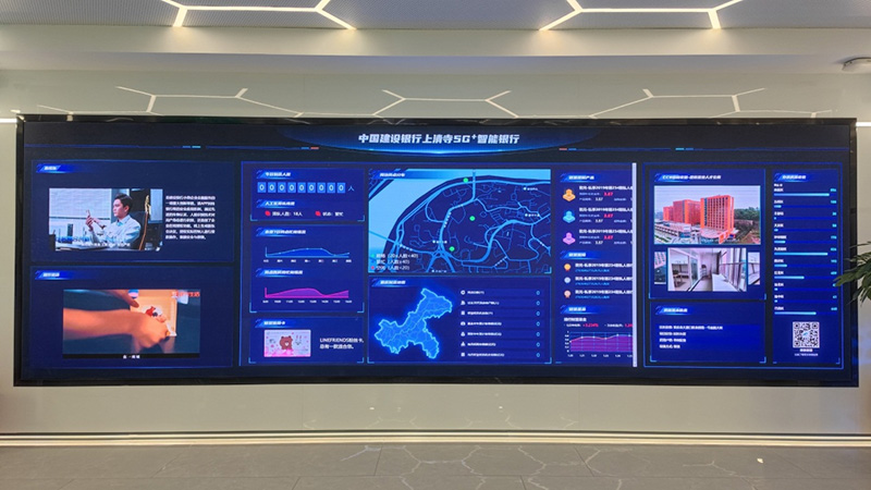 數據可視化大屏。通過部署數據可視化大屏,運用建行最新金融科技成果,集中展示建行住房金融、普惠金融等戰略業務及網點大數據。其中,住房金融版塊主要展示重慶建行近年來在住房租賃業務方面的成果;普惠金融板塊主要展示建設銀行運用現代技術和數據重塑普惠金融服務模式和客戶體驗形成的普惠金融“建行模式”;除此以外,網點基礎數據也以可視化形式展現出來,直觀地向客戶展示網點基本情況。