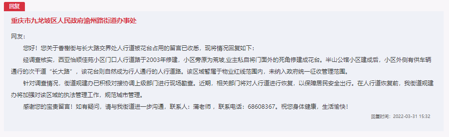 收到網友留言,重慶市九龍坡區渝州路街道辦事處立即安排工作人員現場核實后,給網友進行了回復: