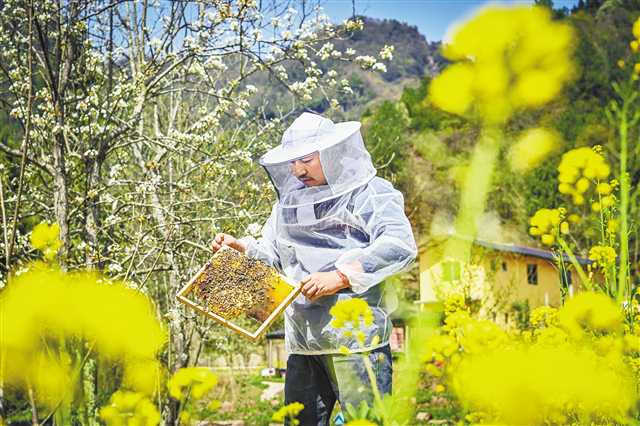 3月28日,石柱縣中益鄉鹽井村中蜂養殖基地,蜂農在檢查中蜂。